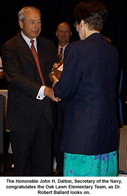 As the National Champions for Division 1 (K-6th grade) in a nationwide Navy contest to find a name for the new ship, the nine fifth-graders from Oak Lawn Elementary School in Cranston were in town to hear the Secretary's announcement at a ceremony at the U.S. Navy Memorial. The Division 2 National Champion (7-12th grade), St. Martin's Lutheran School of Annapolis, Maryland, was also honored during this exciting, non-traditional Navy ceremony. Secretary Dalton announced that the next Navy satellite mission that will study the oceans from space, will be named CORIOLIS -- the name the St. Martin's Team had proposed for the new ship.