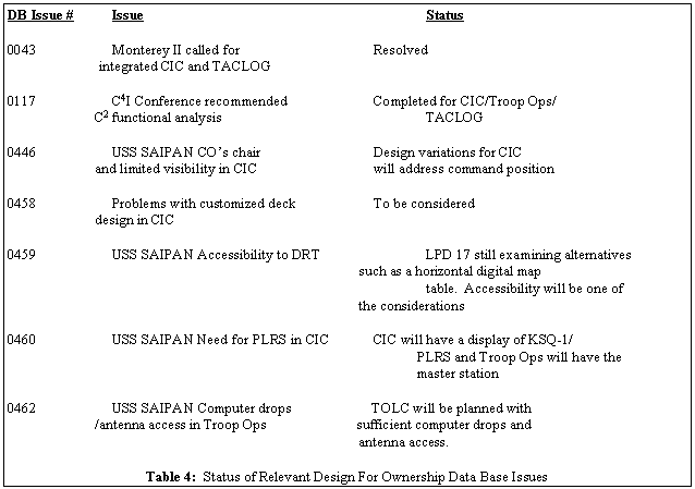 The following issues were raised during the course of the workshop. Those resolved will be entered into the LPD 17 Design for Ownership Issues DataBase for historical documentation. Those requiring resolution or which will impact LPD 17 will also be entered into the LPD 17 Design for Ownership Issues DataBase for further action by the PMS 317 Ownership Team and/or the Configuration Change Board.