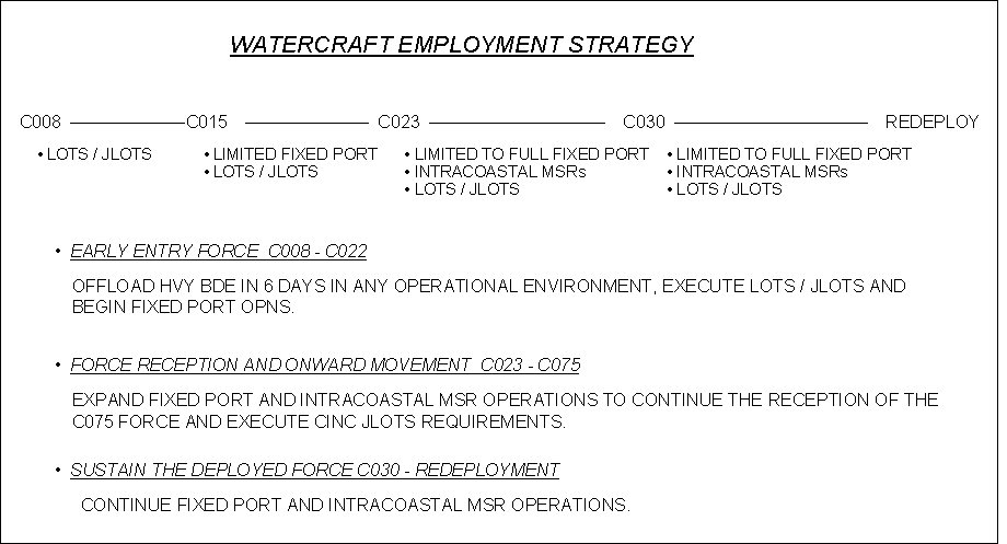 2-5. EMPLOYMENT OF WATERCRAFT. The foundation for Army fleet requirements are based on offloading the heavy brigade afloat in accordance with the objectives of the ASMP. This places the focus on the most demanding early entry watercraft mission Logistics-Over-the-Shore. As reception of the force proceeds, and infrastructure improvements are made, we expect to quickly transition to fixed-port operations. This section outlines phasing of Army watercraft in support of a contingency, in any geographical location.