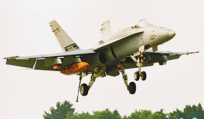 | TAILHOOK down, a Hornet carrying JASSM comes in for an arrested landing at Patuxent River's catapult and arrestment test site. |